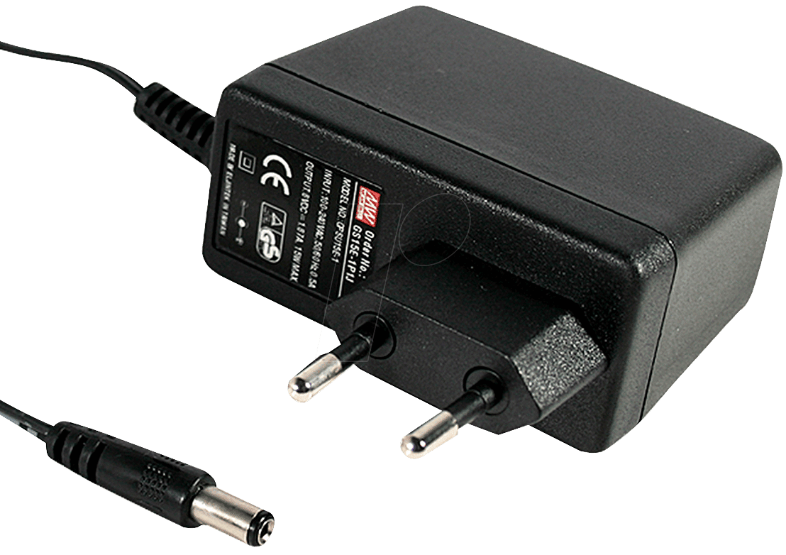 MeanWell Stecker-Schaltnetzteil, GS15E-SerieAusgangsspannung: 9 V DCAusgangsstrom: max. 1,66 ALeistung: 15 WRestwelligkeit: 80 mVppEffizienz: 80%Steckernetzteil mit EurosteckerUniversaleingangÜberlastschutz durch Abschalten, auto recoverygeschützt gegen Kurzschluss, Überlast, ÜberspannungIsolationsklasse IIniedrige LeerlaufleistungEingangsspannungsbereich: 90 … 264 V AC (47 … 63 Hz) / 127 … 370 V DCEinschaltstoßstrom, max.: 50 ALeerlaufleistung, max.: 0,3 WBetriebstemperaturbereich: 0…+50 °CLänge der Zuleitung: 1,8 mAusgangsstecker, Koax: 2,1 x 5,5 mm