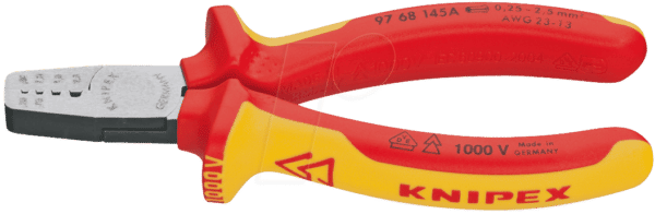 Diese Details zeigen, dass die KN 97 68 145 bis ins kleinste Detail durchdacht ist. Die brünierten Köpfe sorgen für eine hohe Verschleißfestigkeit, während die Mehrkomponenten-Hüllen einen sicheren und komfortablen Griff gewährleisten. Die Zange ist für Aderendhülsen mit einem Querschnitt von 0,25 bis 2,5 mm² geeignet und deckt somit ein breites Spektrum an Anwendungen ab.